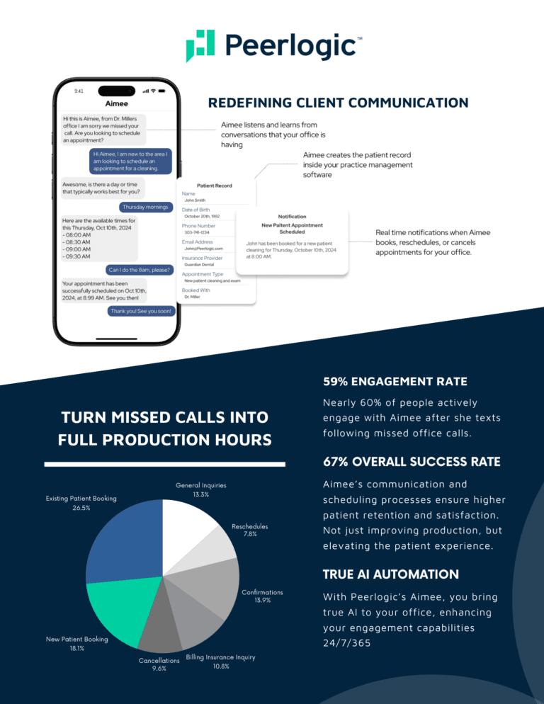 Peerlogic transforms the way dental practices manage communication by unlocking the value hidden in patient interactions through AI. By capturing and analyzing the data exchanged during calls and seamlessly integrating with the phone system and practice management software, Peerlogic delivers actionable insights and advanced conversational AI solutions. Its AI messaging assistant, Aimee, handles end-to-end conversations, ensuring patients feel fully assisted—even when the office is busy or closed. Peerlogic ensures no opportunity is missed, staff performance is optimized, and practices achieve sustainable success while enhancing patient care.